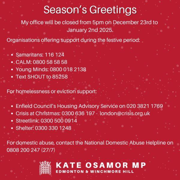 Kate Osamor MP – Weekly Update – Friday 20 December 2024